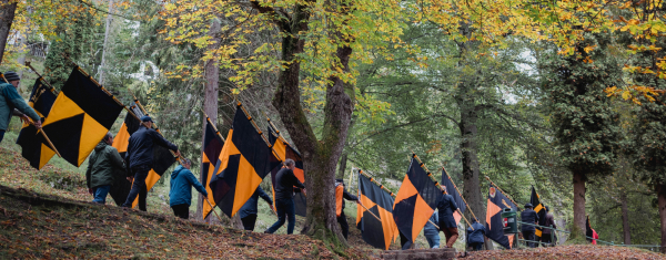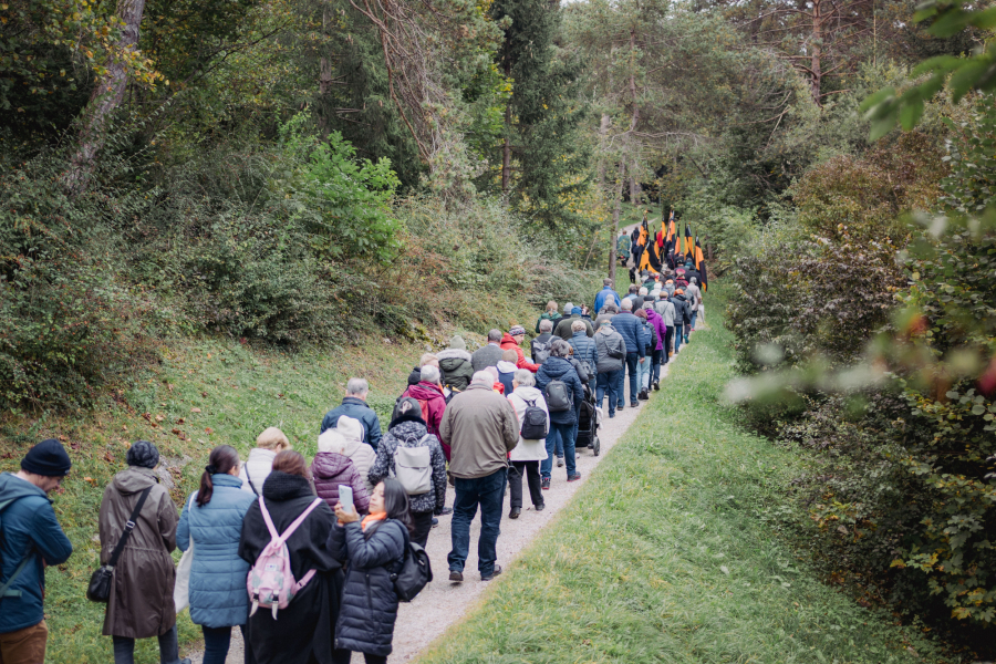Die Bannerträger führen den Pilgerzug an, der an vier Stationen Halt machte. Raphael Hupe schlüpfte in die Rolle des heiligen Korbinian, der auf seinem Weg nach Rom verschiedene Personen traf, die den Teilnehmenden Impulse für den Weg mitgaben. „Wo sind meine Ruheorte, welche Ratschläge gebe ich aus meiner Glaubensüberzeugung heraus anderen, vor welchem Unrecht möchte ich Menschen heute warnen?“ waren einige Gedanken, die Mitglieder der Kommission Spiritualität als Denkanstöße und Gesprächsimpulse setzten.
