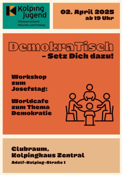 Die Diözesanleitung der Kolpingjugend veranstaltet in Zusammenarbeit mit der neu gegründeten Kolpingjugend München Zentral ein Worldcafé zum Thema "Demokratie" im Kolpinghaus München Zentral. Eingeladen sind neben den Bewohnerinnen und Bewohnern der Kolping-Wohnheime alle Jugendlichen und jugen Erwachsenen aus dem gesamten Diözesanverband.
