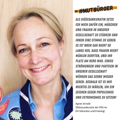 Ich erlebe immer wieder Menschen, die in Ländern leben müssen, wo aufgrund der politischen Gegebenheiten die Personwürde der einzelnen Menschen missachtet wird. Ein gutes, friedliches und gemeinsames Leben zu gestalten ist da nicht möglich. Damit solche Verhältnisse bei uns nicht eintreten, brauchen wir Mut, um eine starke Demokratie ohne Fundamentalisten und Extremisten zu etablieren. Ich bin dabei!