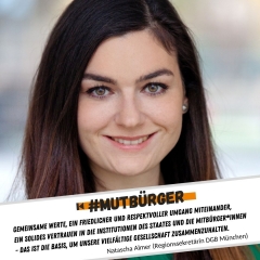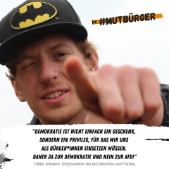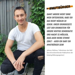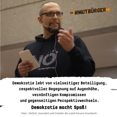„Unsere Demokratie ermöglicht jedem von uns Teilhabe, freie Meinungsäußerung und Mitgestaltung. Als #mutbürger schütze und vertrete ich genau diese Werte. Auf demokratischer Basis zusammen diskutieren, sich auszutauschen und voneinander lernen. Darum geht’s.“