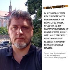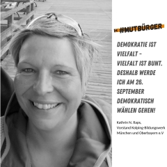 Als #mutbürger stehe ich für die freie Meinungsäußerung ein und akzeptiere andere Meinungen, aber ich stelle mich laut und vehement gegen populistische und extreme Standpunkte. Mit meiner Stimme bei der Bundestagswahl für eine demokratische Partei unterstütze ich unsere bestehende Demokratie. Mit jeder Stimme, die nicht an eine extreme Partei geht, wird deren Einfluss im Bundestag genommen und unsere Demokratie gestärkt.