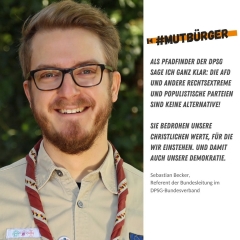 Im zweiten Schöpfungsbericht (Gen 2,19) hat Gott uns den Auftrag gegeben, den Dingen Namen zu geben. Dieser Auftrag gilt auch heute. Wenn Menschen Ressentiments stärken, Angst schüren und die Verbrechen im Nationalsozialismus relativieren, müssen wir ihnen einen Namen geben: Faschisten! „Ein Pfadfinder sagt, was er denkt und tut, was er sagt“ (Pfadfindergesetz). So wie der Heilige Georg wollen auch wir gegen die Drachen unserer Zeit kämpfen - nicht mit der Lanze, nicht mit dem Schwert, sondern mit dem Wort und mit dem Wahlzettel; mit den Mitteln der Demokratie. Ich gehe wählen, damit Faschisten nicht wieder ins Parlament einziehen, damit der Spuk ein Ende hat.