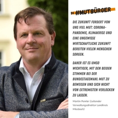 Mut bedeutet Furchtlosigkeit – angesichts einer Situation, in der man Angst haben könnte. Die Zukunft fordert von uns viel Mut: Corona-Pandemie, Klimakrise und eine ungewisse wirtschaftliche Zukunft bereiten vielen Menschen Sorgen. Daher ist es umso wichtiger, mit den beiden Stimmen bei der Bundestagswahl Mut zu beweisen und sich nicht von Extremisten verlocken zu lassen. Ein Land voller #mutbürger ist stark und muss keine Sorgen vor der Zukunft haben!